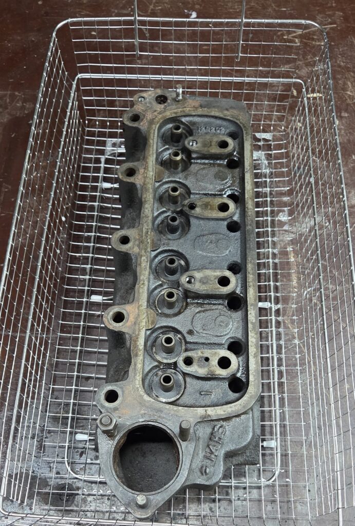 The fully stripped cylinder head is now submerged in a chemical bath to thoroughly dissolve all carbon buildup and debris. This process ensures a perfectly clean foundation, allowing us to accurately inspect the part for any hairline cracks or imperfections. A clean head is vital for a gas-tight sealing required for reliable compression.